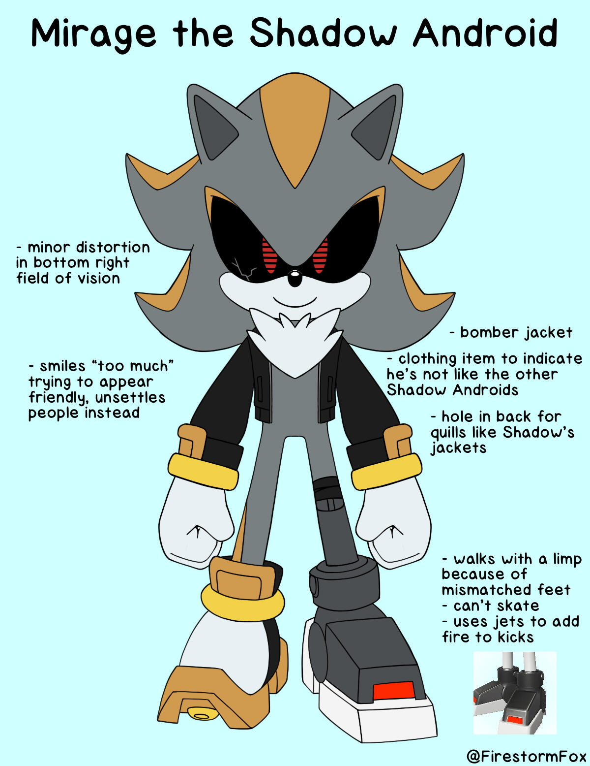 In the fallout of Neo Metal Sonic's rebellion, Cinder found a damaged Shadow Android and attacked it on sight. Using her wits and the fact that it was already damaged, Cinder bested the android. Just before finishing it off, she noticed a pronounced fear response that the other Shadow Androids hadn't exhibited, instead deciding to spare him. Cinder took the android home and repaired him the best she could, naming him Mirage. As he had no where else to go, the android stayed with Cinder.Shadow the Hedgehog